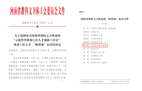 近日,河南省教科文卫体工会委员会印发《关于选树命名河南省教科文卫体系统“示范性劳模和工匠人才创新工作室”、优秀工匠人才、“师带徒”标兵的决定》(豫教科文卫体工〔2021〕24号),新葡萄官网旅游学院教师贾红丽荣获河南省教科文卫体系统“师带徒”标兵荣誉称号,此项荣誉全省仅有11对。