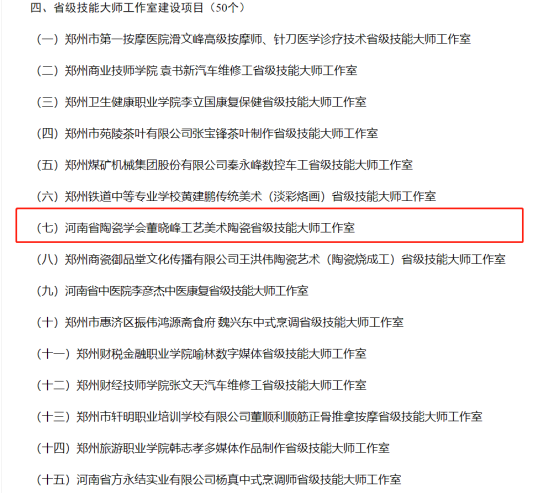 近期,河南省人力资源和社会保障厅发布《河南省全民技能振兴工程领导小组关于公布2021年全民技能振兴工程建设项目名单的通知》,新葡萄官网“董晓峰工艺美术陶瓷技能大师工作室”成功获批河南省人力资源和社会保障厅2021年河南全民技能振兴工程建设项目。