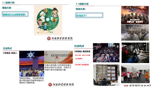 为深入贯彻习近平总书记关于“大思政课”建设的重要指示精神,确保2022年春季开学思想政治教育第一课取得扎实成效,物流与电商学院教师精心备课,在开学第一周线上教学中结合时事热点,将课程思政有机融入开学第一课,将“高度”“深度”“厚度”与“温度”融入绪论课,让具有“物电特色”的新学期第一课在云端精彩呈现。