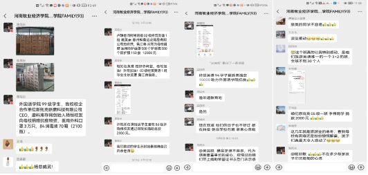 在母校急需防疫物资的信息发出后,身处全国各地的各届校友纷纷伸出援助之手。他们中有校企合作单位,多年来一直接收我院学生实习就业的斯托克研磨科技有限公司CEO、磨料库存网创始人杨恒校友,有河南听道教育集团董事长夏胜男校友,有旅游行业从业者,有仍在深造的学生……