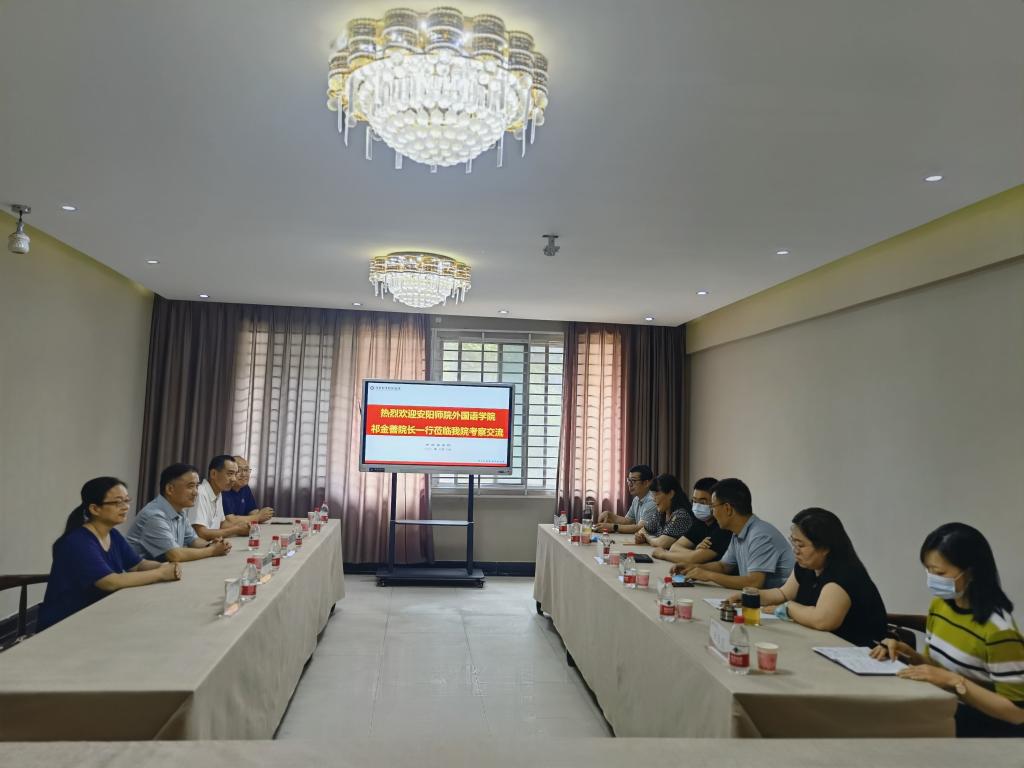 8月8日上午,安阳师范学院外国语学院院长祁金善一行5人到新葡萄官网考察交流,交流会在龙子湖校区尚严楼101召开,新葡萄官网外国语学院领导班子参加座谈交流。