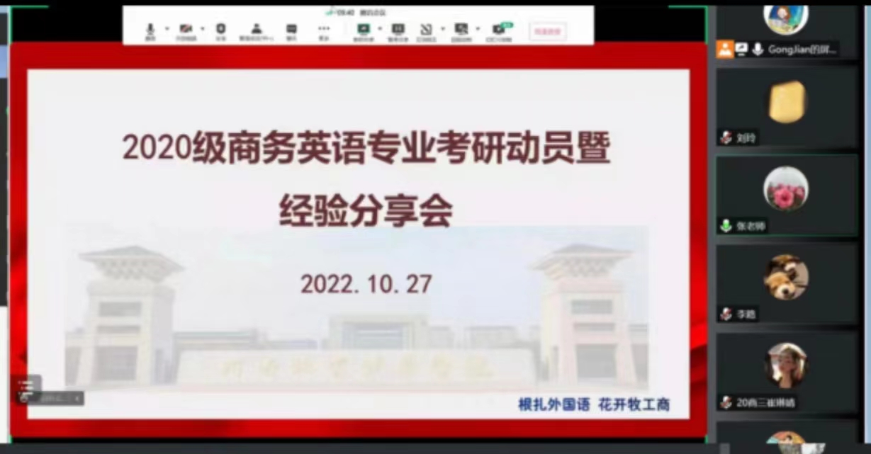 为进一步提升人才培养质量,10月27日下午,外国语学院以线上形式召开2020级商务英语专业学生考研动员暨经验分享会。外国语学院部分领导、相关专业课教师、优秀毕业生代表及考研学生参加会议。会议由外国语学院副院长巩坚主持。
