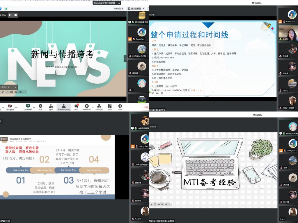分享会上,外国学院副院长闻华、巩坚及商务英语教研室老师,分别结合自身的经历就考研与就业、参考书目选择、资料信息收集、时间安排、复习方法、应试技巧等同学们普遍关心的问题,进行了交流与分享,并围绕近两年毕业生的录取院校及报读专业情况做出针对性分析,通过详实的数据为学生们提供借鉴和参考。2018级商务英语专业优秀毕业生李路等四位同学就如何高效的制定学习计划给出了各自的意见和建议。