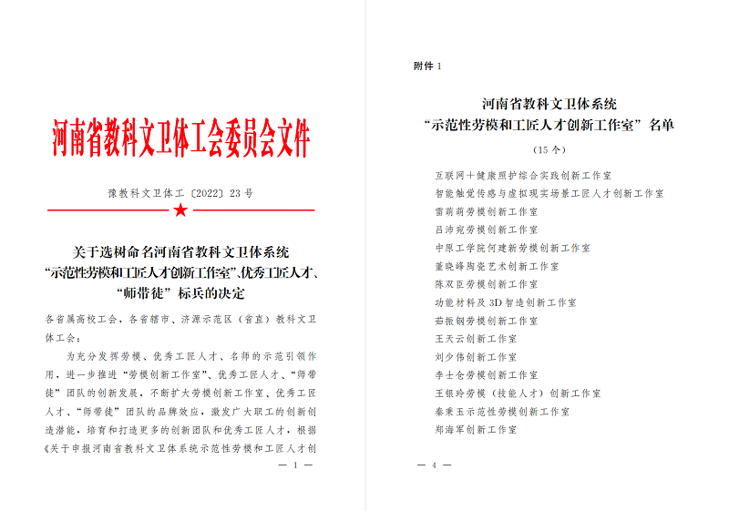 近日,河南省教科文卫体工会下发《关于选树命名河南省教科文卫体系统“示范性劳模和工匠人才创新工作室”的决定》文件,新葡萄官网艺术学院“董晓峰陶瓷艺术创新工作室”获此殊荣。