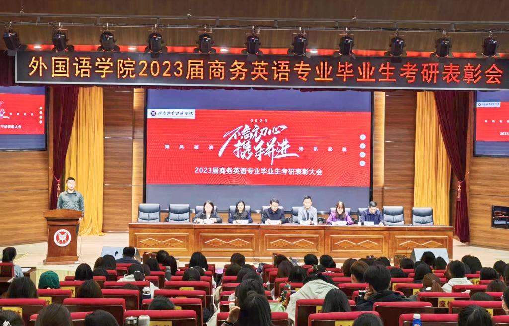 4月25日中午,外国语学院于尚严楼100报告厅召开2023届商务英语专业毕业生考研表彰会。外国语学院、弘远书院领导班子成员出席表彰会,受表彰教师、学生以及商务英语专业学生代表参加此次会议,会议由外国语学院副院长巩坚主持。